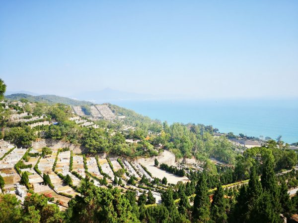 深圳大鵬灣華僑墓園位於沙頭角東部大小梅沙側的特區管理線內,面對浩瀚的大鵬灣,坐擁一綫海景,背靠梅沙尖山,左右有大鵬灣半島及吐露港黃竹角等拱衛,風水極佳,是安放先人理想之地。單個穴位面積約為4.5平方米(1.5米x3米),可葬棺木、骨殖或骨灰。配備有中港靈車、中港旅遊巴等各種設施。墓園四周建有亭台樓閣、花園、湖心亭等,環境優美。